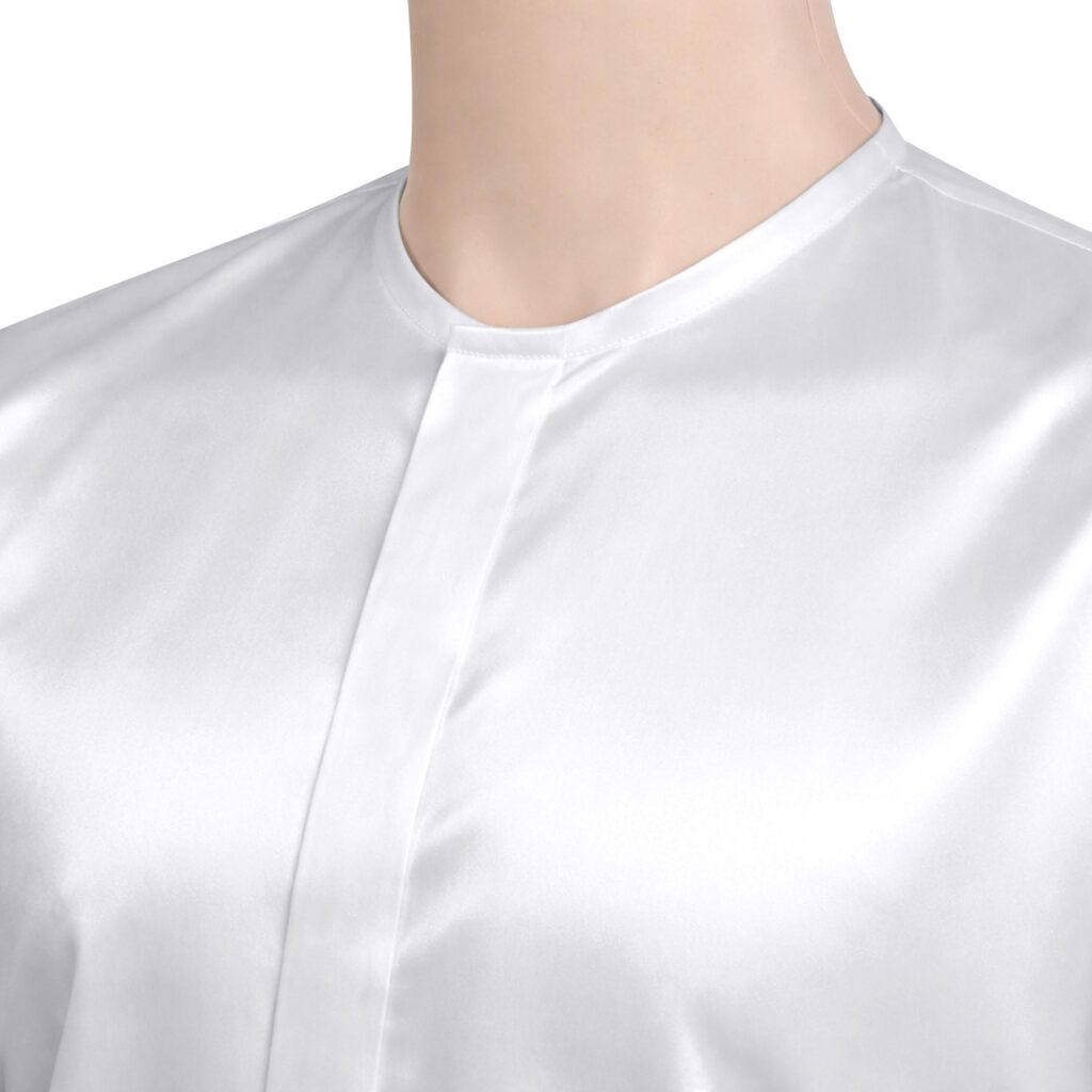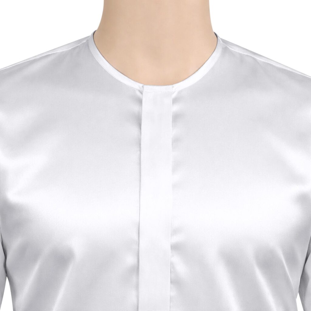 Collarless White Silky Satin Shirt Black Buttons