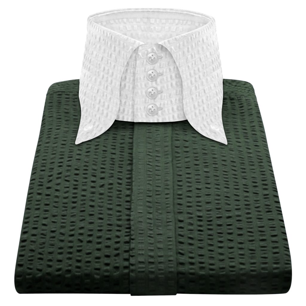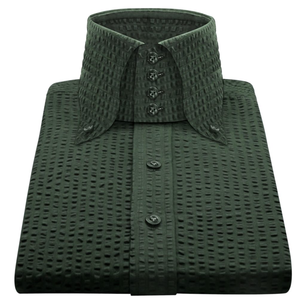 Navy Blue Seersucker High Button Down 4 Button Collar