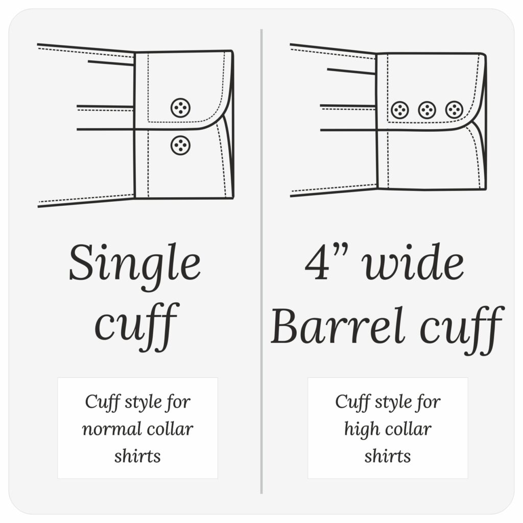 Cuff Style : Single – Convertible cuff or 4″ wide 3 button Barrel cuff