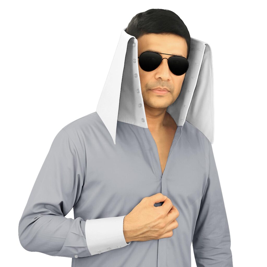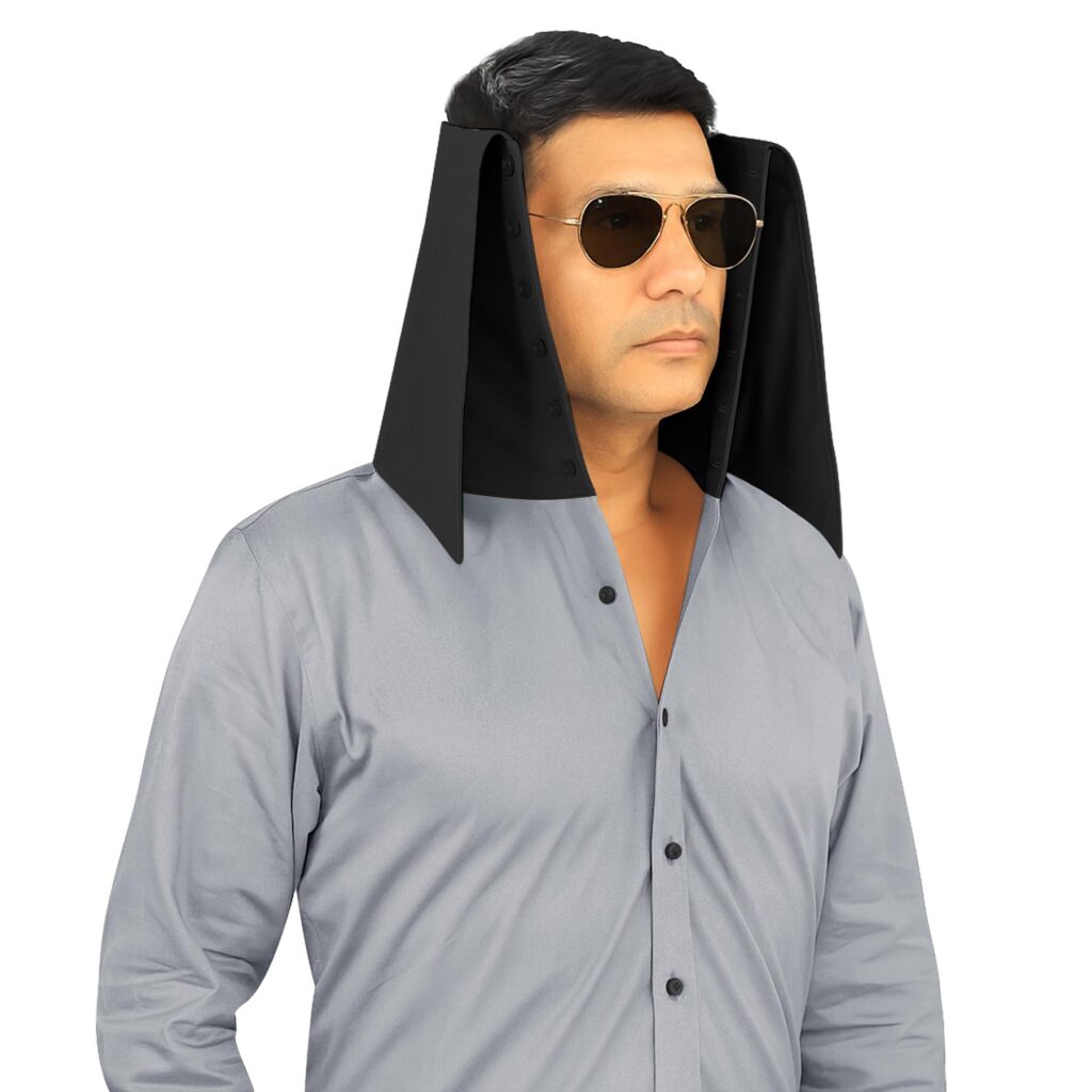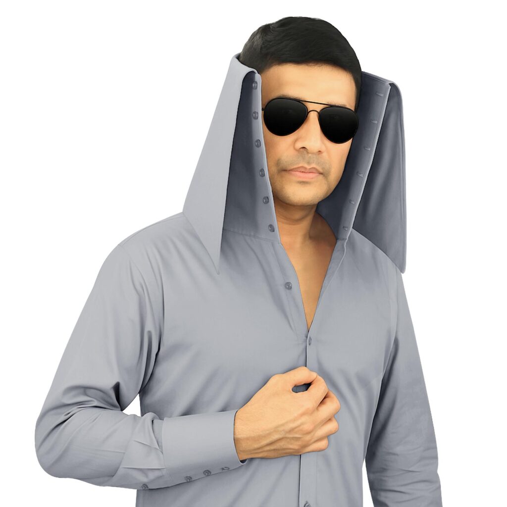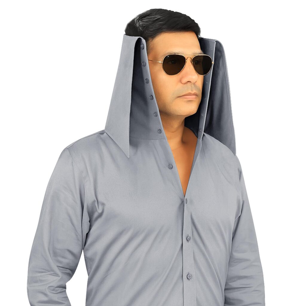 Dramatic, highly oversized 9″ tall stand up collar with 6 buttons