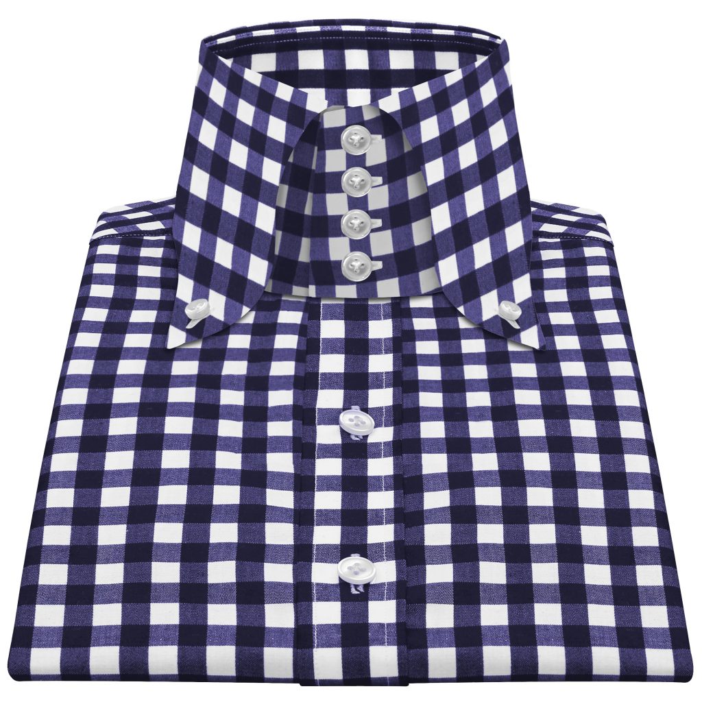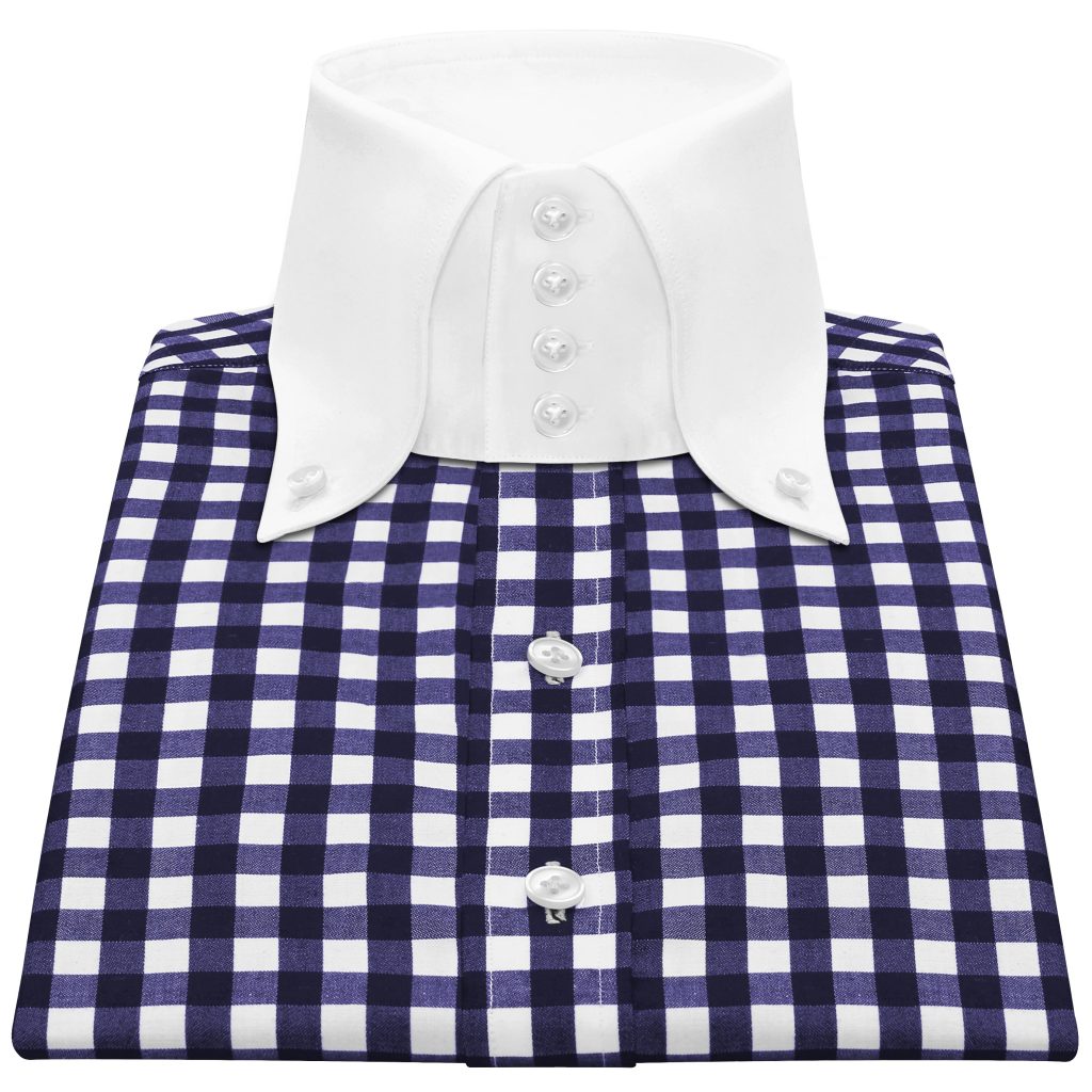 Navy Blue Gingham Checks High Button Down 2 Button Collar