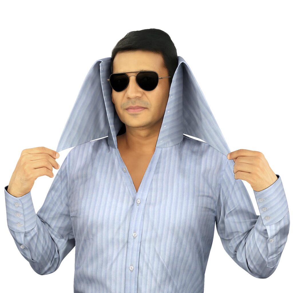 Sky Blue Self Stripes High Long Round Tip 2 Button Collar