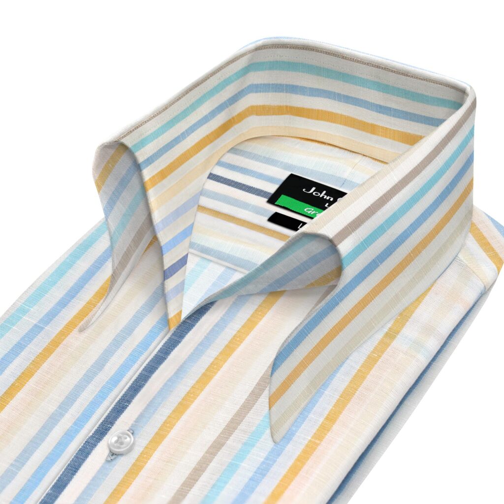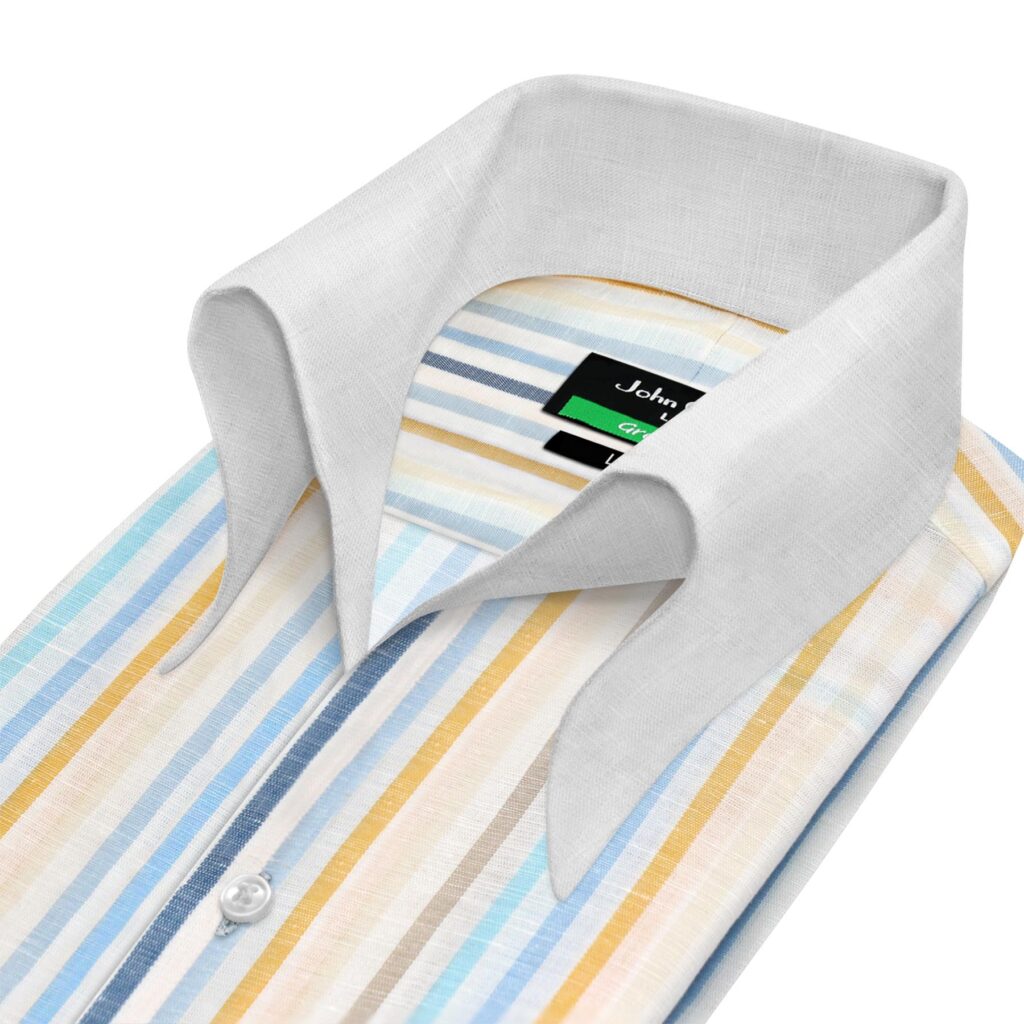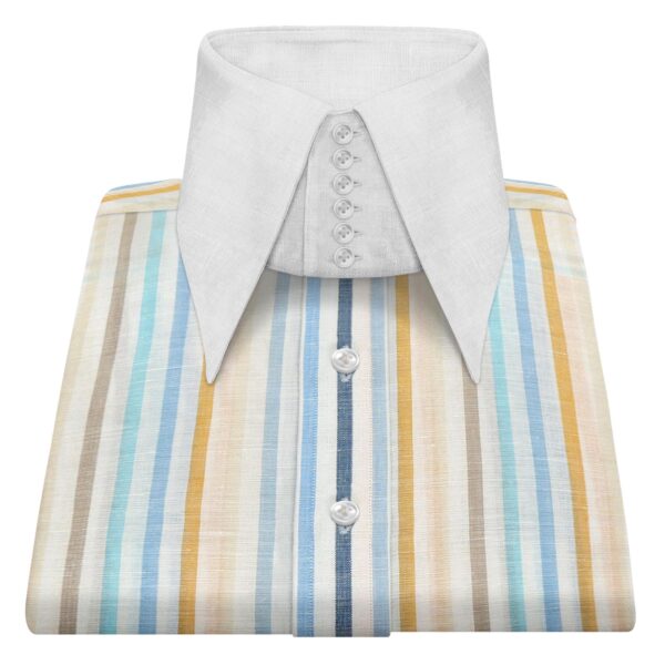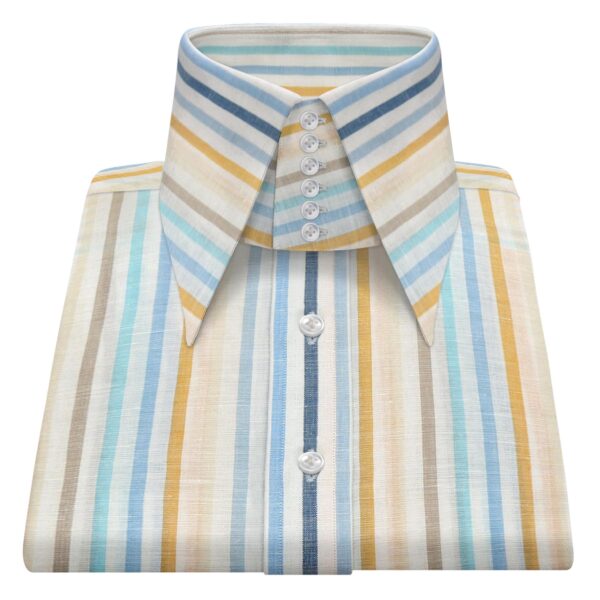Beige Stripes Linen High Open Button Down Collar
